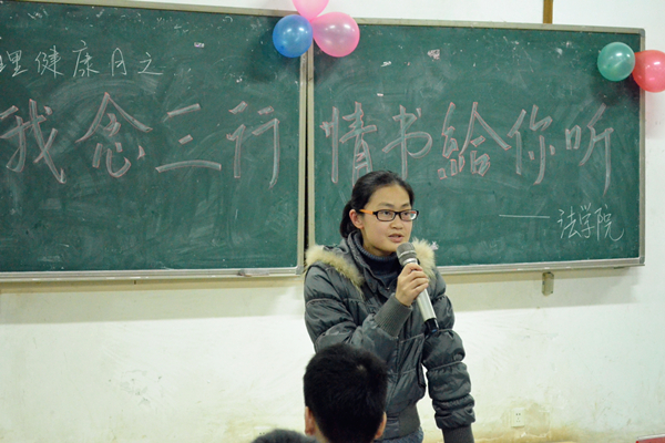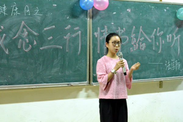 ——记太阳集团城网址83138心理健康月之“我念三行情书给你听” 爱你,只用三行字来表达。情书三行,为爱发声。4月23日晚7时,太阳集团城网址83138心理健康月之“我念三行情书给你听”初赛于八教1-3教室举行。莅临此次活动的嘉宾有辅导员赵晗冰老师、团委第二副书记段欣、学生会副主席姚逸飞以及各部部长。2015级全体学生到场观看。 莎士比亚曾经写过“十四行情诗”仍觉意犹未尽,如今8位选手将“情”话浓缩成唯美的文字,只三行,便跃然纸上。法学三班李文俊同学以一首藏头诗大胆说出自己“既直且忠”的爱情,同时将《诗经》的古朴典雅与《离骚》的含蓄优美巧妙融合,赢得掌声阵阵。将严峻冷酷的法律写进深情温柔的诗句又是怎样一番滋味呢?法学二班文章华愿成为一部民诉,陪伴守护她一生。正如那句,陪伴是最长情的告白。 在这个世界上,最爱我们的,莫过于父母。“你藏死鬓角的白发/我假装看不见你眼角的皱纹/都只是不想承认时间逝去了你的年华”岁月不经意间从身边划过,我们的青葱岁月伴随着他们的老去。法学二班杜芳芳为亲情发声,触动了多少人的内心。“平淡如烟的人生有两个小幸运点缀足矣/一是遇见你/一是走到底”,法学二班王卓时向大家讲述了她与“亲”妹妹的故事:虽无血缘关系,却拥有至亲至爱的美好回忆。 经过激烈的角逐,李文俊、王卓时获得一等奖;张琴、杜芳芳、罗翎雪获得二等奖;文章华、卜芝月、陈泓廷获得三等奖。 大赛最后,赵晗冰老师也分享了自己的作品:“你站在那里/世界就是一首情诗/我愿用莎士比亚的方式爱你”,并总结道“通过比赛,我看到了同学们内心的丰盈与澎湃,这才是青春的感觉。最真挚的情感,原本就不需要过多的语言来描述。爱你,三行足矣”。 (责任编辑:admin) |