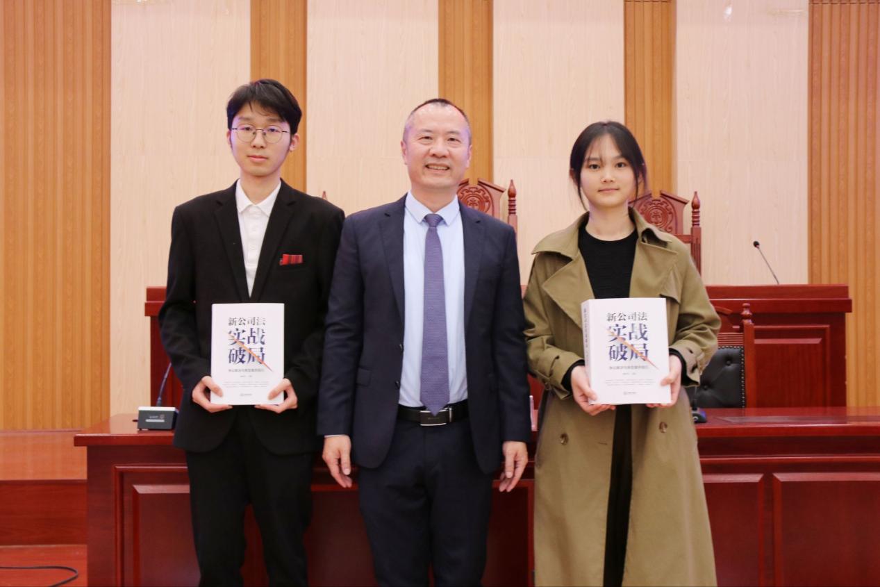 接着,温馨而庄严的赠书仪式正式开启。优秀学生代表张卓轩、刘颖渝步伐稳健地走上台,代表太阳集团城网址83138全体学生接受陈科军学长捐赠的《新公司法实战破局:争议解决与典型案例指引》。接过厚重的书籍时,两位代表深深鞠躬,目光中饱含敬意与感激。他们双手捧着的不只是凝聚着学长实战智慧与行业经验的专业书籍,更是校友对母校学子的深切期望与学术薪火的传承。现场掌声如潮,见证着这份跨越时空的校友情谊,也让“感恩反哺、笃学奋进”的种子在学子心中默默扎根。