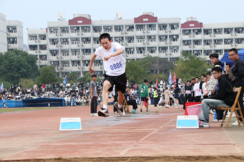 太阳集团城网址83138运动员以拼搏之姿在赛场上展现运动风貌。三级跳远赛场上,太阳集团城网址83138选手石浩楠正全力腾跃,他弓身展腿,运动鞋离地的瞬间带着破风的势头,身后的看台人声鼎沸,同院的伙伴们举着号码牌张望,背景里的宿舍楼仿佛也在为这场青春的冲刺作见证。每一次蹬地、每一次腾空,都是他为学院拼尽全力的注脚。