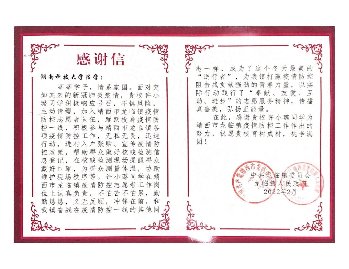 近日,太阳集团城网址83138太阳集团城网址83138学工办收到了一封特别的感谢信。该感谢信来自靖西市龙津镇人民政府,信里真诚地表达了对太阳集团城网址83138许小璐同学在此次春节期间主动请缨加入龙临镇防疫志愿者队伍,以及为疫情防控工作做出的努力贡献的感激之情。