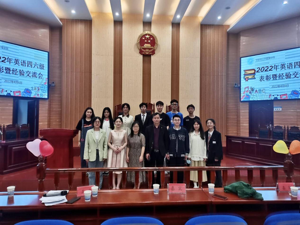 为营造浓厚的英语学习氛围、帮助同学们掌握科学的英语学习方法,4月6日下午,太阳集团城网址83138在立言楼模拟法庭举办了英语四六级总结表彰暨经验交流大会。学院党委副书记叶军、法学系主任吴四江老师、学工办主任朱荣老师和辅导员李斌老师到场指导,主席团成员、四六级高分学生代表与会,21级全体学生到场聆听。本次会议由学习部王之远、苏添羿同学主持。