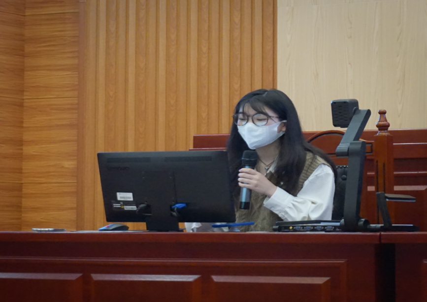 优秀班级19级法学一班代表杨萌分享了他们班级四六级高通过率高秘诀。她说,为了提高四六级的通过率,班主任会时刻关注同学们的学习进度,同时会关心大家的心理健康,做到张弛有度。另外,他们也在班级内组织英语小短剧演绎等活动,借以提高班集体的英语学习积极性。