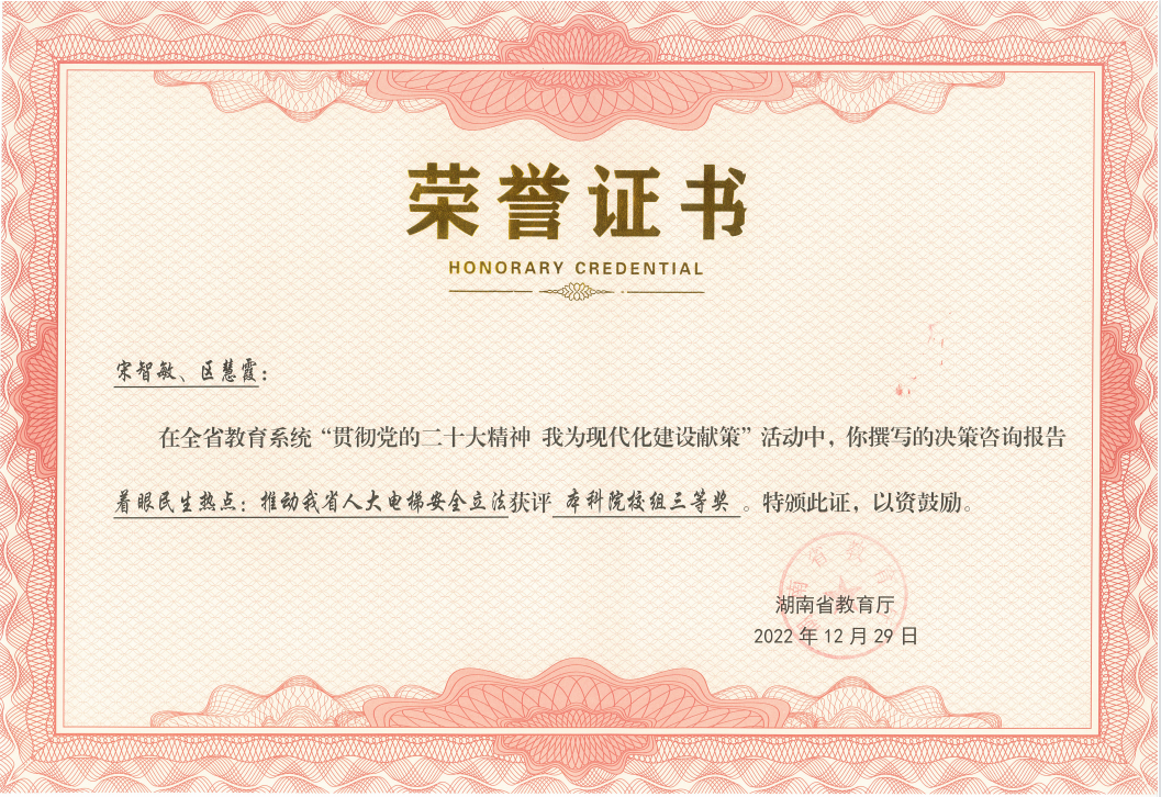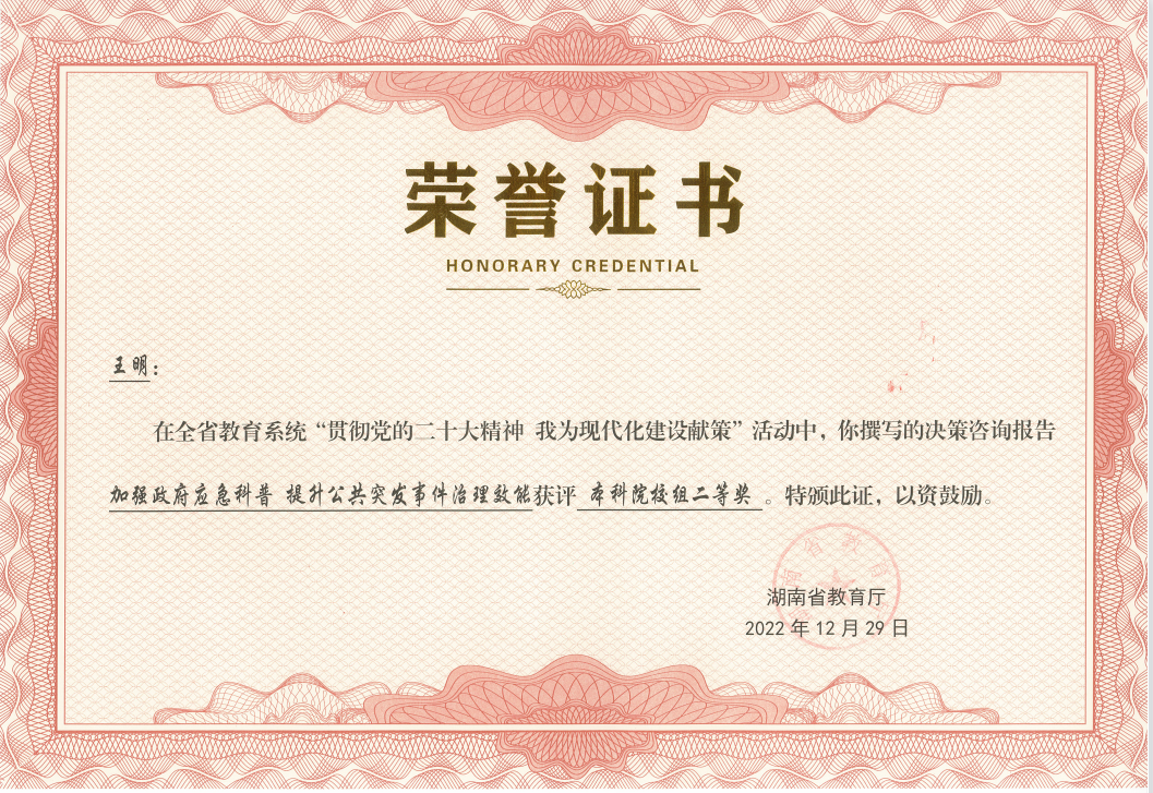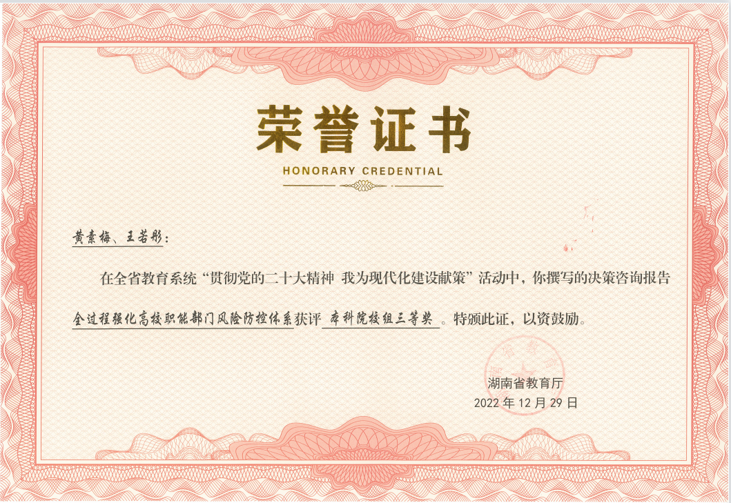 近日,湖南省教育厅公布了“贯彻党的二十大精神 为现代化建设献策”活动评审结果,我校5名教师获奖,学校获“优秀组织奖”,获奖数位列全省高校第三。我校党委书记唐亚阳教授的决策咨询建议《以科技创新引领高端海工装备强省建设》荣获一等奖。太阳集团城网址83138老师获得其余4个奖项,其中王明的《加强政府应急科普 提升公共突发事件治理效能》获二等奖,宋智敏、区慧霞的《着眼民生热点:推动我省人大电梯安全立法》、胡之芳、朱宝桦的《完善企业产权保护,构建对涉罪企业财产处置的动态审查监管机制》、黄素梅、王若彤的《全过程强化高校职能部门风险防控体系》荣获三等奖。