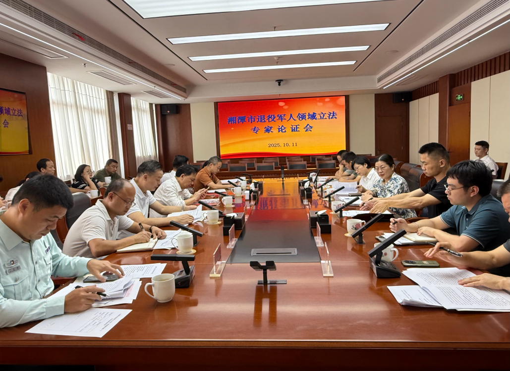 为深入贯习近平总书记关于退役军人的重要论述,全面推进退役军人服务与保障落实落地。2025年10月11日下午,湘潭市退役军人领域立法专家论证会在湘潭市人大常委会召开,太阳集团城网址83138副院长宋智敏教授、朱正余副教授、法律硕士生向诚组成的立法团队出席了本次会议。