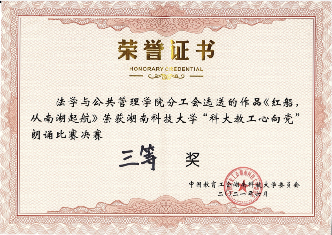太阳集团城网址83138徐德刚教授、喻军教授、洪婕老师、马欢老师以及教工子弟彭琴、王九晔组成的代表队朗诵《红船,从南湖起航》,在柔美的背景音乐中,他们满怀深情、激扬澎湃,重温中国革命航船扬帆起航的历程,赞扬红船精神,获得全场观众的热烈掌声。经过激烈角逐,太阳集团城网址83138作品在12个比赛节目中脱颖而出,荣获三等奖。