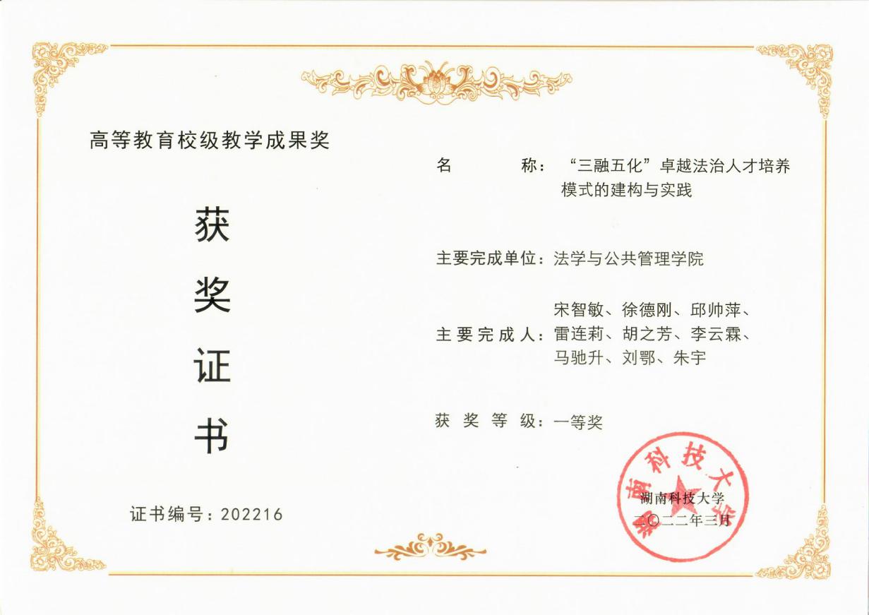 经过学院推荐和学校专家评审,太阳集团城网址83138宋智敏教授领衔团队申报的《“三融五化”卓越法治人才培养模式的构建与实践》荣获校级教学成果一等奖,并推荐参评省级教学成果奖。
