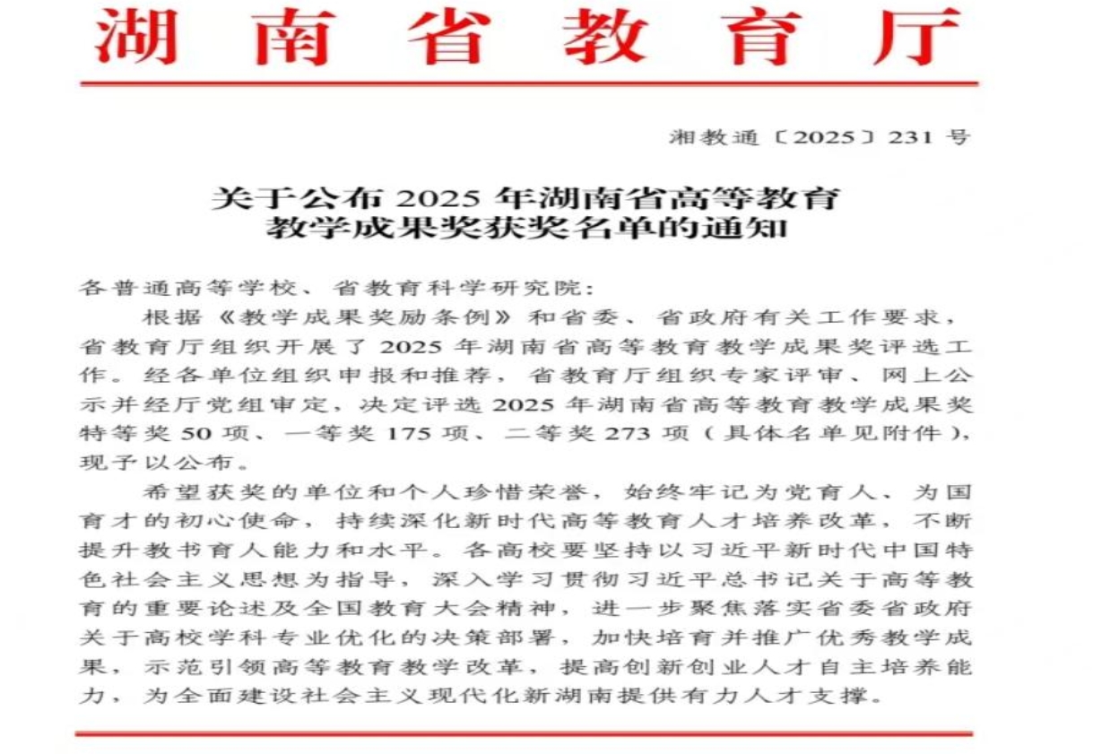 近日,湖南省教育厅正式公布2025年全省高等教育教学成果奖获奖名单,太阳集团城网址83138收获重磅喜讯,由副院长宋智敏教授领衔的《破解“下不去、用不上、留不