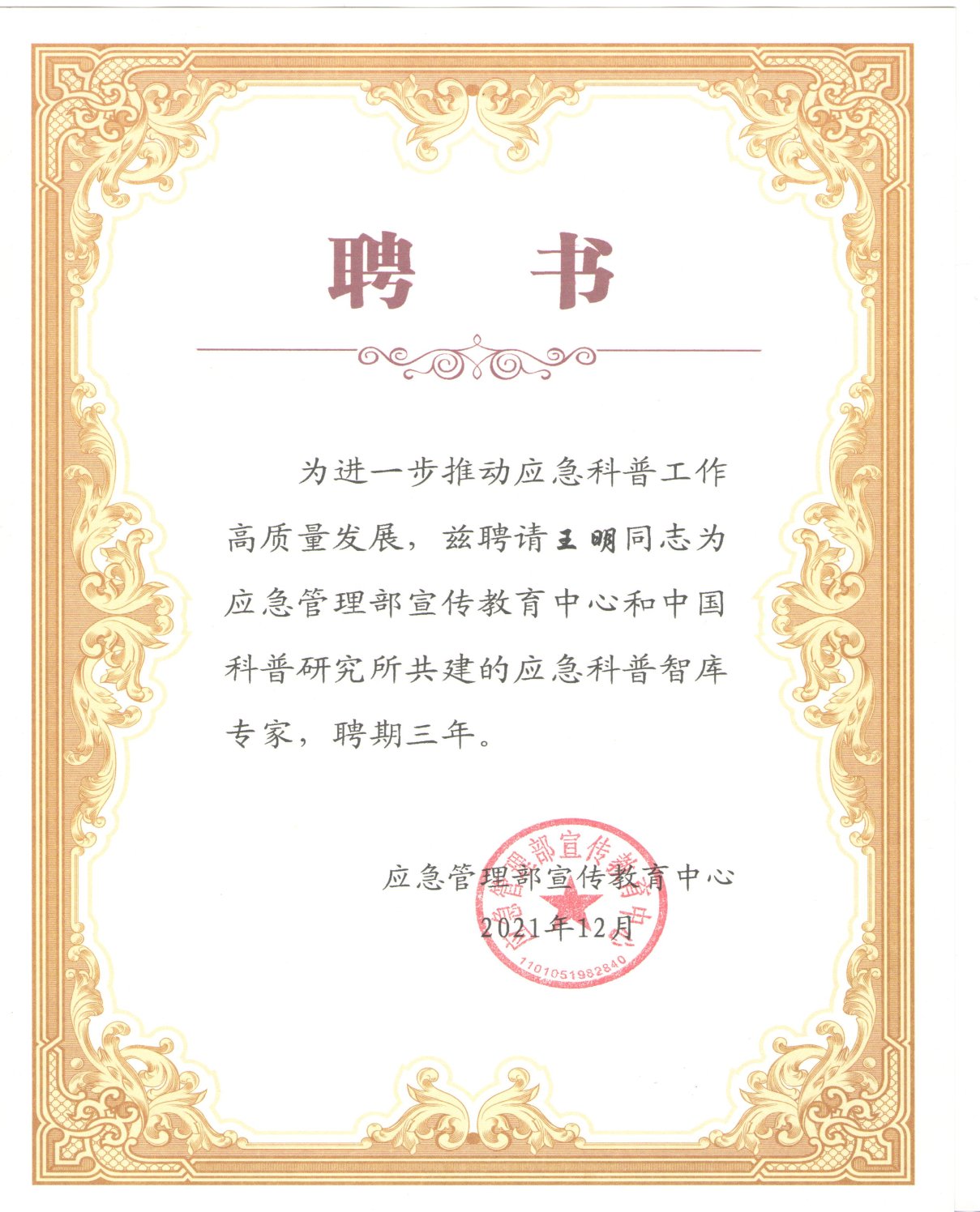 太阳集团城网址83138王明副院长获聘应急管理部宣传教育中心应急科普智库专家