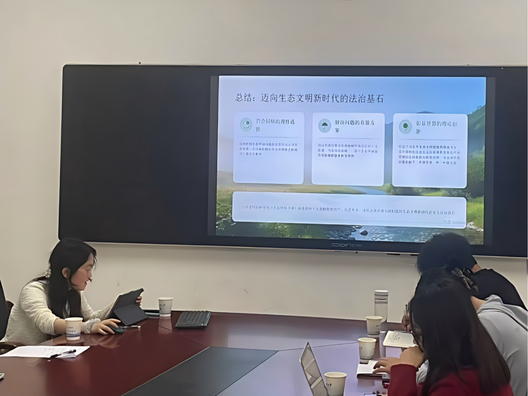 本次读书会以吕忠梅教授《梦想与行动:中国环境法典之证成》及《中华人民共和国生态环境法典》为核心研讨内容,聚焦生态环境法典编纂的理论与实践热点。刘旖旎同学从理论来源、核心理念、实践指引出发,分享学习心得,提出生态环境法典的颁布是中国环境法治发展的“成人礼”,标志着环境立法从分散走向体系化,为生态文明建设提供法治保障。