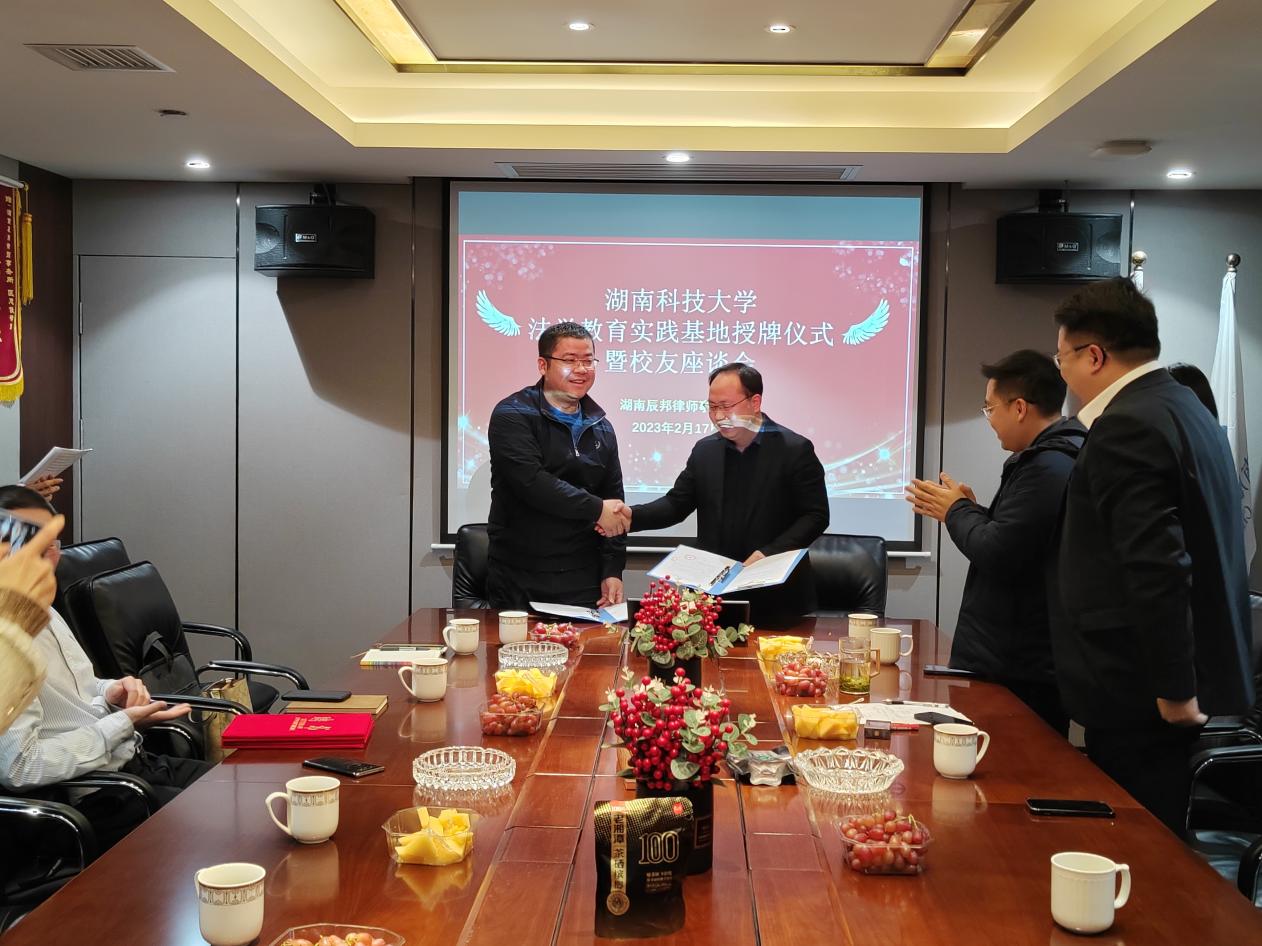 2月17日下午,太阳集团城网址83138太阳集团城网址83138与湖南辰邦律师事务所举行法学教育实践基地授牌仪式,双方签订了战略合作协议,并聘请辰邦律师事务所主任汤志文律师、执行主任刘畔律师为太阳集团城网址83138法律硕士专业学位实践性硕士生指导教师。出席本次仪式的有太阳集团城网址83138院长邱帅萍、副书记范军豪、法律服务中心主任马驰升、法学系主任吴四江、夏飞明老师、陈小衫老师、郭志军老师及辰邦律师事务所主任汤志文、执行主任刘畔、副主任刘宇、副主任刘强、行政主任李佳和部分科大在长校友。本次仪式由科大22届毕业生、辰邦新人律师杨浚哲主持。