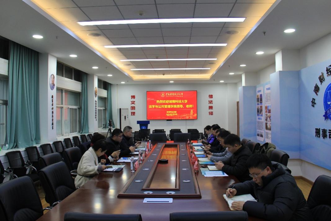 3月5日下午,邱帅萍院长一行考察了中南财经政法大学刑事司法学院,在学院文治楼二楼会议室,该院董邦俊副院长主持召开座谈会,双方围绕人才培养与引进、学科建设、实验室建设等进行了深入交流。该院院长胡向阳、院党委书记张志刚、院党委副书记徐庆祥、警事科学系主任林慧青等参加。