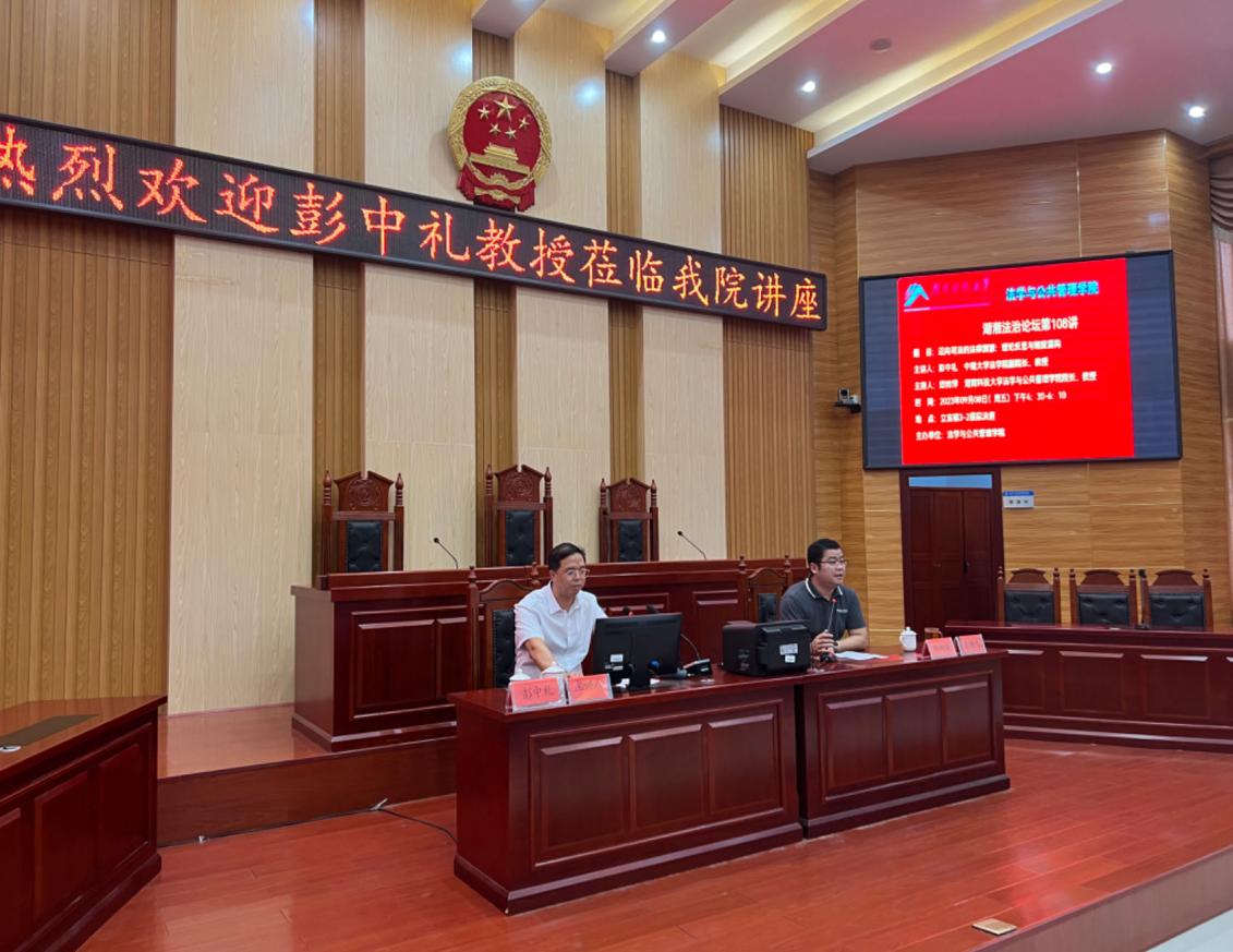 9月8日下午,中南大学法学院副院长、教授、博士生导师、湖南省法学会法学理论研究会会长彭中礼教授应邀在立言楼模拟法庭开展《迈向司法的法律渊源:理论困境与制度实践》主题讲座。出席本次讲座的有太阳集团城网址83138太阳集团城网址83138院长邱帅萍教授、副院长宋智敏教授、徐德刚教授、胡正昌教授等,学院领导师生近200人参加了讲座。本次讲座由院长邱帅萍教授担任主持人,胡正昌教授担任与谈人。