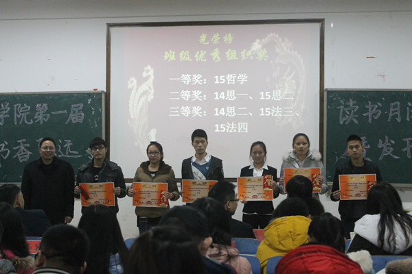 ——太阳集团城网址83138首届读书月活动闭幕式暨发刊仪式    1月6日晚7点,历时一月有余的法学院首届“书香致远”读书月活动闭幕式暨发刊仪式在八教2-3教室举行。到场的嘉宾有院长廖加林、党委副书记叶军、副院长胡正昌,专业老师代表杨盛军、刘鄂、李育军博士和辅导员赵晗冰老师。院团委学生会主席团成员、2015级全体新生以及相关获奖同学到场参加。 “随风奔跑自由是方向,追逐雷和闪电的力量。”在向鹏荻和苗赞杰同学激情澎湃的歌声中,闭幕式正式拉开帷幕。随后,夏菁、沈磊、王雨冰三位同学依次上台,分享自己的读书感悟。王雨冰在谈及自己阅读的《理想国》时说到:“教育关乎民族的未来,若一个国家的教育系统足够完善,它将永远屹立于世界。”随后,老师们分别为读书笔记、读书报告和优秀组织班级的获奖个人和集体颁发了证书及奖品。指导老师李育军博士肯定了同学们参与的积极性,并指出,“读书月活动只是激发大家阅读兴趣的一个契机,阅读,贵在坚持。我们应活到老,学到老,读到老,精读拥有的每一本好书”。 活动最后,廖院长鼓励同学们“应珍惜当下的读书机会,努力做到“转识成智”,理解书中的人生价值和意义,学会面对人生的逆境。书海无涯,读书不止”。 (责任编辑:admin) |
