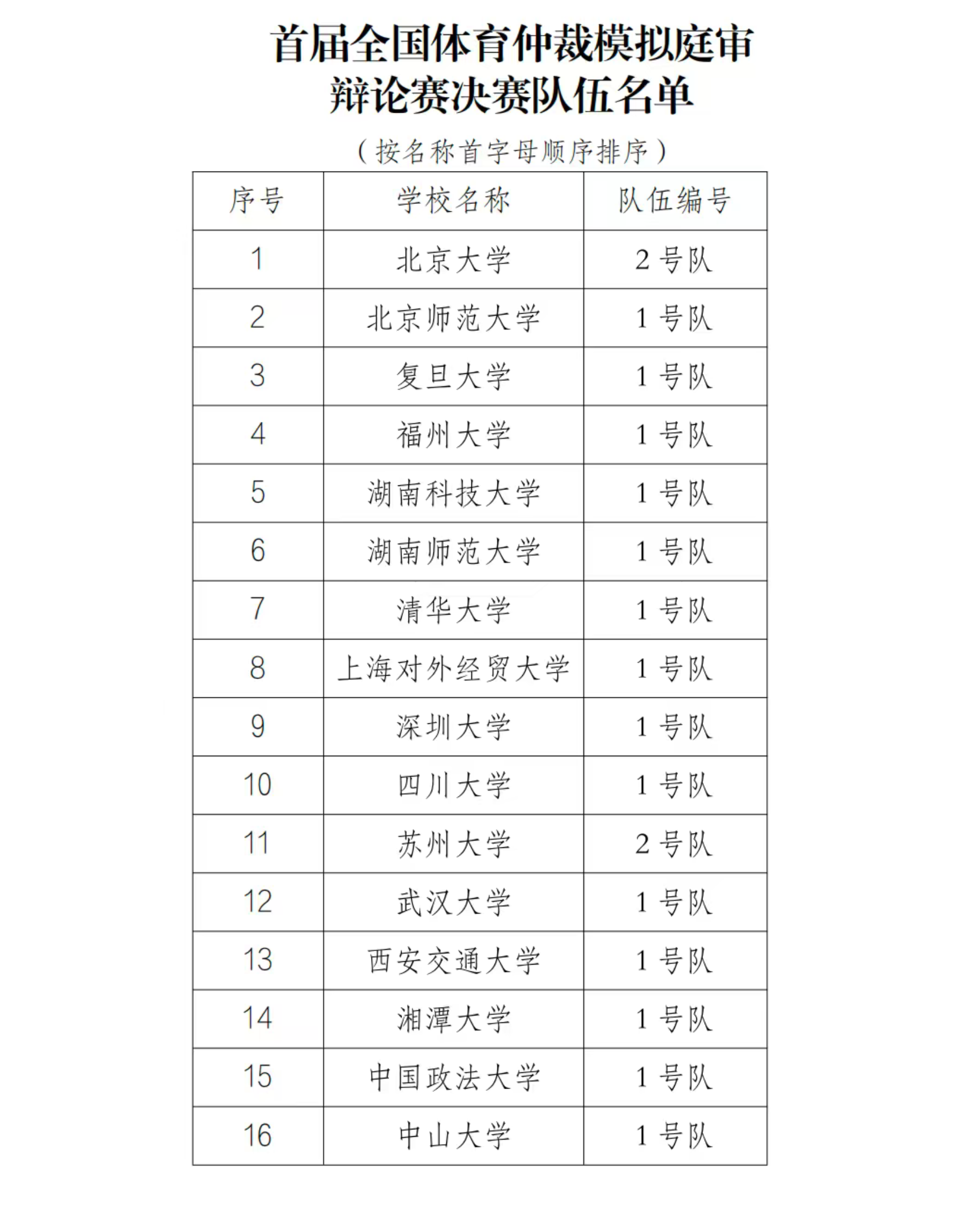 近日,中国体育仲裁委员会正式发布《关于首届全国体育仲裁模拟庭审辩论赛决赛阶段比赛有关安排的通知》及决赛队伍名单。经过组委会评审组专家两轮盲审和一次集中会评,经过角逐,全国16支队伍成功晋级决赛。