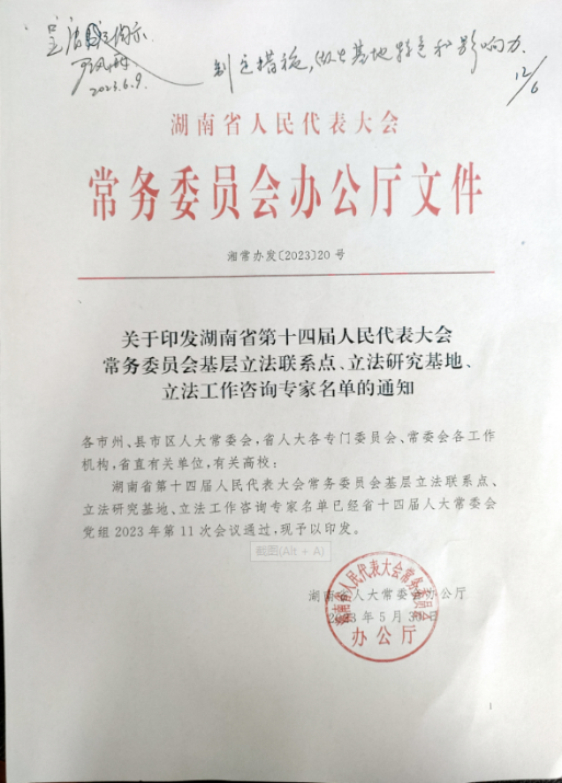 2023年5月30日,湖南省人大常委会办公厅印发通知,太阳集团城网址83138太阳集团城网址83138获批湖南省第十四届人民代表大会常务委员会立法研究基地。