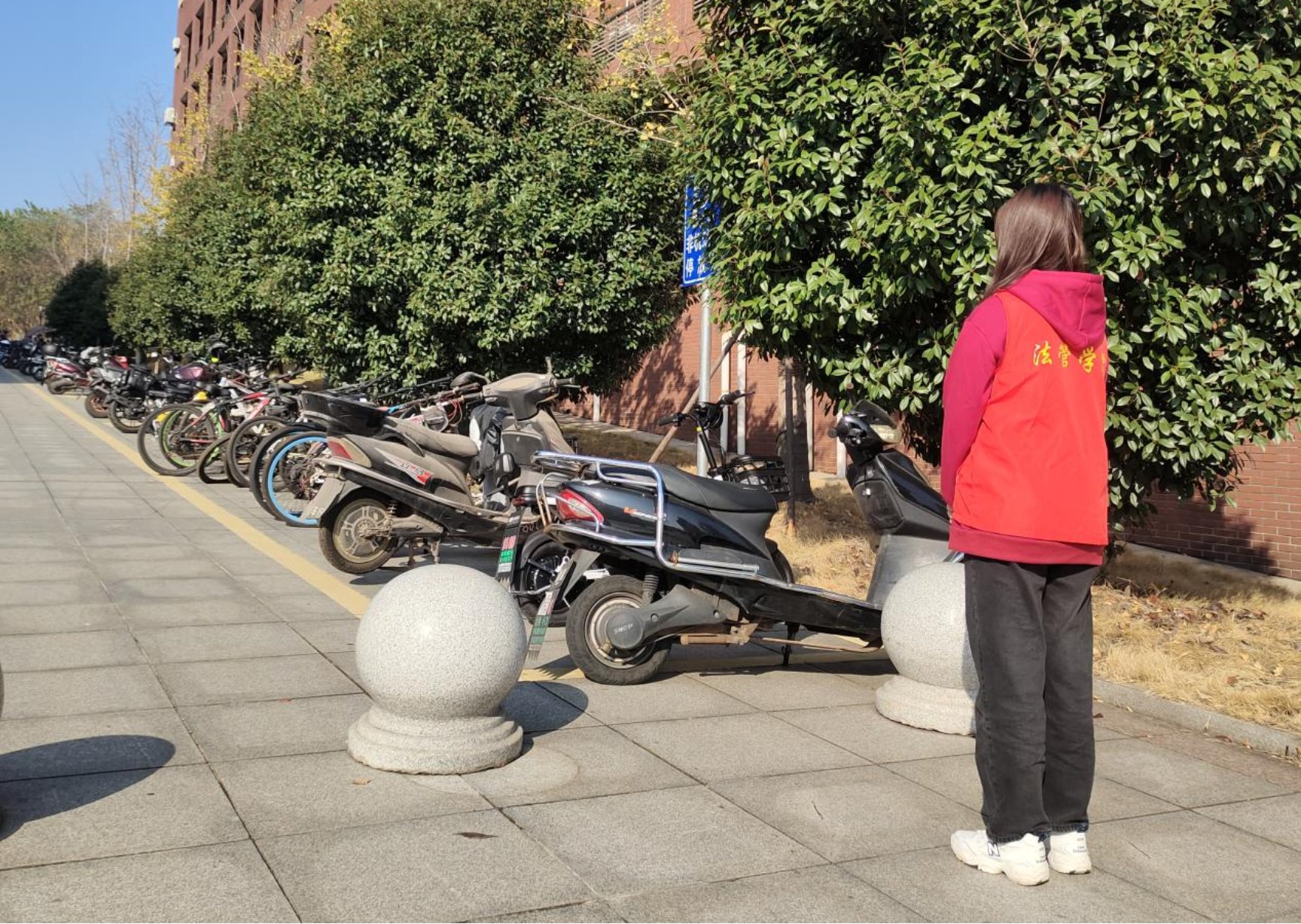 21级公管一班候政浩同学在接受采访时表示,“以前立言楼内院的车太多了,又是汽车,又是小红,自行车更是数不胜数。有些僵尸车,长期没人认领,不仅影响美观,更阻碍交通”“这些车辆总是横七竖八地乱摆,尤其是上下课高峰期,把路全给堵塞了,要进教学楼还要绕远路,一点都不方便”他的回答说出了很多同学的心声。而在整治行动开展以来,立言楼的停车状况有了很大改观。作为经常出入立言楼的学生,他更是有直观的感受。“现在好多了,每辆车都有了自己的‘归宿’,上下课也更加方便,堵在‘心’里的‘石头’终于没了”候政浩笑着说道。