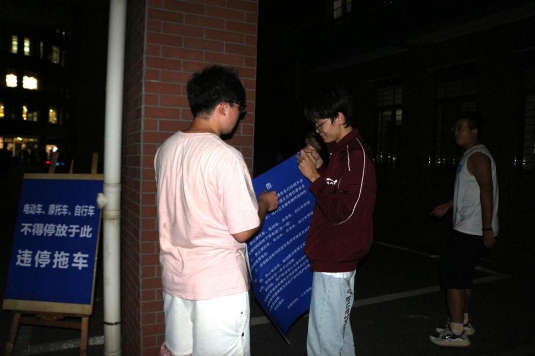 “一二,起……一二,走”立言楼院内响起嘹亮的呼喊声,那是同学们正在拖移违规停放车辆。“不要着急……先贴一角”不远处则是学生们在张贴学校通告和车辆停放示意图。虽然此前领导老师曾多次提出过文明行车、规范停车的要求,但由于没有出台立言楼区域较为明确的停车规范,以致于乱停乱放,僵尸车的现象没有得到根本解决。现在学校出台了《太阳集团城网址83138交通安全管理规定》,所以此次行动,不仅将违规停放车辆安置到指定区域,更是贴出确切通告与示意图,向全体学生说明哪些地方能停,哪些地方不能停。将规则诉诸纸上,把规范置于心中,既治标,更治本。