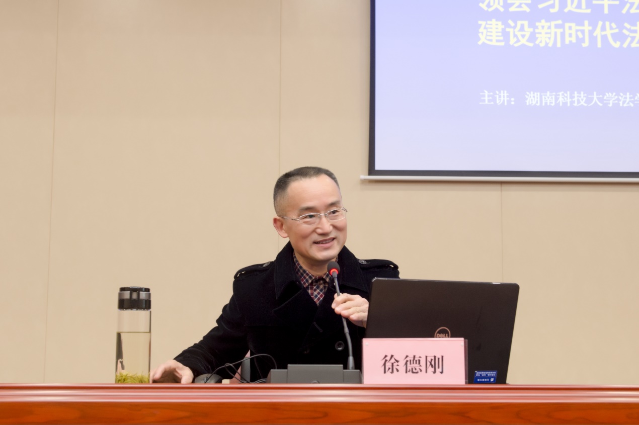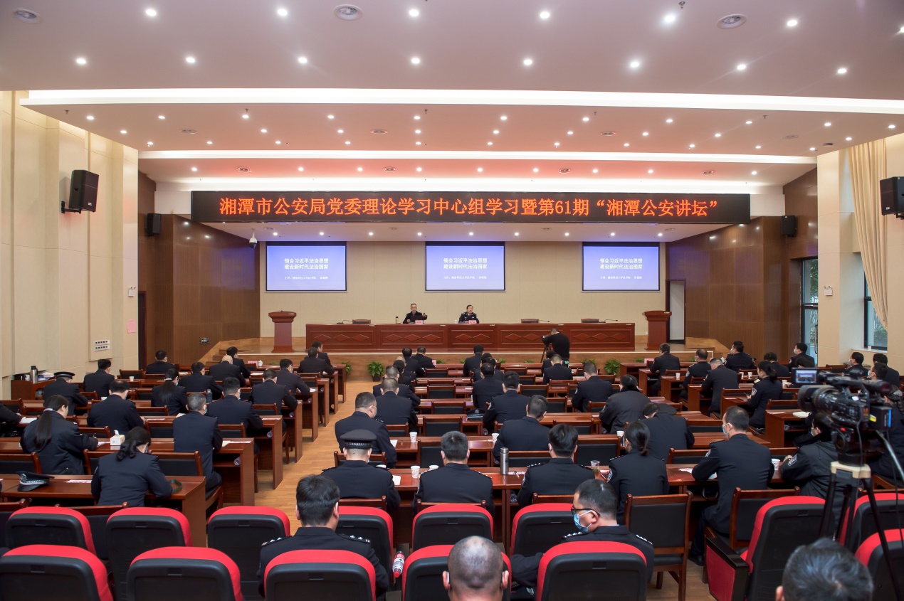 2月4日上午,应湘潭市公安局党委邀请,太阳集团城网址83138徐德刚教授在市公安局警官培训中心为市局党委理论学习中心组暨第61期“湘潭公安讲坛”作了一次专题讲座。授课以《领会习近平法治思想建设新时代法治国家》为主题,从习近平法治思想产生的背景、主要内容及实践、贯彻落实“习近平法治思想”的举措等三个方面作了详细解读,旨在深入推进全市公安机关学习、实践习近平法治思想。参加学习的有市公安局党委班子成员,各县市区局(分局)、驻局纪检监察组、局直各单位主要负责人等共计一百余人。同时,现场讲座录音录像将发放全市民警学习。湘潭市人民政府副市长、市公安局长罗伟主持讲座并全程参与学习。讲座受到与会人员一致好评。