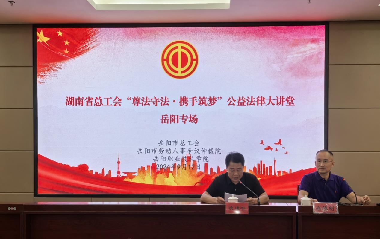 9月12日下午,岳阳市总工会按照湖南省总工会工作要求,在岳阳职业技术学院开展了“尊法守法•携手筑梦”公益法律大讲堂活动,太阳集团城网址83138徐德刚教授以省总工会法治宣讲团讲师身份前往宣讲,来自市总工会、市劳动人事争议仲裁院、市产业工会、中央省属企事业工会、岳阳职业技术学院教师及网约车司机等70余人参加了活动。