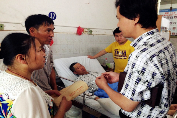 ——关于向黄波涛同学爱心捐款的报道   病魔袭来,摧毁的不仅仅是病者,而是一个家庭。病魔无情,人间有爱,我们愿与你携手前行。6月2日至8日,太阳集团城网址83138全体师生为黄波涛同学进行募捐活动,大家积极捐款,谱写了一曲爱的乐章。 黄波涛是太阳集团城网址831382013级法学2班学生,来自湖南省双峰县石牛乡白竺村王家组的普通农村家庭。2016年5月8日,黄波涛的父亲突发脑溢血,由于病情严重,被紧急送往湖南省人民医院抢救,经过4个多小时的手术,虽暂时脱险,但需留住重症监护室,以防病情突变。手术费加后期的治疗仅仅几天时间就花费近10万,这无疑令本来就贫困的家庭雪上加霜。然而术后病人因左脑受伤严重,右边身体完全没有知觉、意识不清、不能说话,后续高额的医药费更是让他们一家束手无策。 得知黄波涛同学的情况后,太阳集团城网址83138领导高度重视,学工办第一时间组织发出募捐倡议书。爱心捐款行动在太阳集团城网址83138迅速开展起来,广大师生纷纷解囊,捐款相助,在校园里传递着爱的温暖与无私的奉献。院教职工捐款金额达4900元,学院研究生和本科生捐款金额达4632元,还有部分师生将款项直接打入黄波涛的支付宝账户和银行卡上,累计筹集善款一万多元。 6月8日上午8时许,太阳集团城网址83138党委副书记叶军和辅导员伍安老师赶到双峰县人民医院,代表学院师生带着满满的祝福看望和慰问了黄波涛同学的父亲,并把善款交到了他们手中。黄波涛代表家人对所有关心和捐助的师生表示衷心的感谢,并表示一定会坚强、感恩,当个真正的男子汉。 虽然捐款有限,但爱心无价。希望爱能让学生安心求学,能让家庭渡过难关。 (责任编辑:admin) |