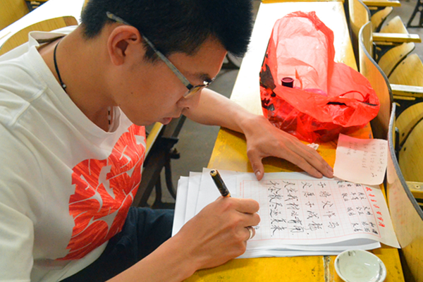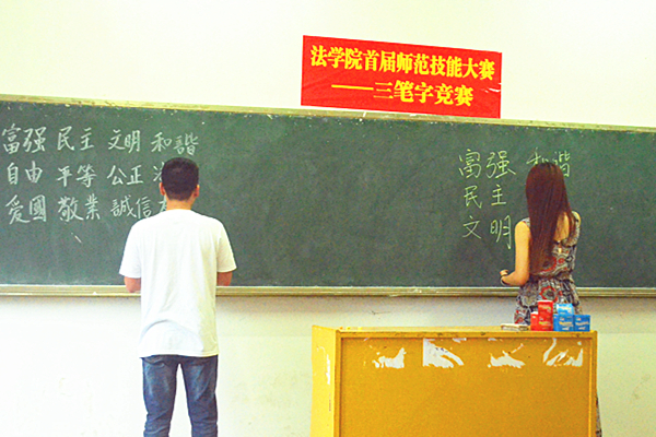 ——记法学院第一节三笔字大赛决赛 5月7日上午8点30分,法学院第一届师范生技能大赛---三笔字决赛,于十教203、206教室举行。太阳集团城网址83138院长廖家林,副院长胡正昌、陆自荣,思想政治系系主任毛小平,哲学系系主任颜中军,思政系朱学恩、杨盛军老师莅临活动现场。 本次大赛的参赛选手由13-15级思政专业各班推荐,比赛项目分别是钢笔、粉笔和毛笔,以软硬笔为标准分别在两个教室同时进行。书写内容分为必写和任意两部分,形式灵活多样,内容生动。在他们上交的参赛作品中,既有恣情挥毫的毛笔字,也有行云流水般的行书,还有娟秀工整的楷书。比赛结束后,评委对他们的作品做出了公正的裁判,并对本次大赛给予了高度的评价。高松、甘恒业凭借其坚实的书法基础斩获了本次比赛的一等奖,另有14人荣获二等奖和三等奖。 此次师范生书法比赛的举办,让我们领略了思想政治教育系同学们的独特才情,给书法爱好者提供了一个展现才艺的平台,更对师范生书法技能的提高起到了很好的推动作用。在幽幽的墨香中,三笔字的决赛落下帷幕。 (责任编辑:admin) |