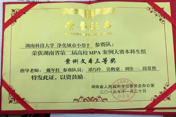 11月20日,由湖南省人民政府学位委员会主办、湖南农业大学承办的“湖南省第二届高校MPA案例大赛”落下帷幕。此次大赛共有来自省内各高校的26支参赛队参与角逐,由太阳集团城网址83138公共事业管理系主任戴年红老师指导的两支参赛队最终脱颖而出,分获本科生组(案例文本)一等奖、三等奖: 一等奖:太阳集团城网址83138 青春集结号参赛队(参赛队员:欧阳旻、于爽、周洁君、屈明月;参赛作品:基于“PPP模式”的历史文化街区建设——以湘潭市窑湾街道为例) 三等奖:太阳集团城网址83138 净化城市小帮手参赛队(参赛队员:谭巧玲、吴鹏豪、刘佳一、邱景然;参赛作品:城市垃圾处理的问题及对策——基于湘潭市雨湖区的案例解读) (责任编辑:admin) |