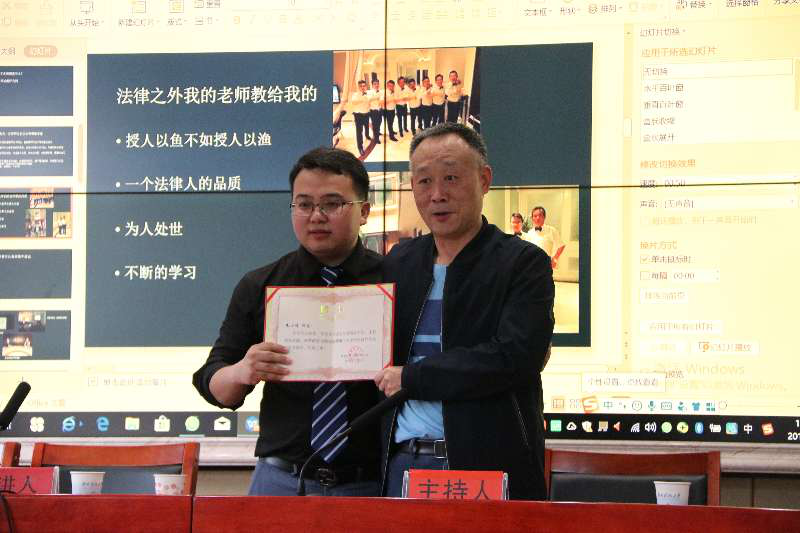 胡正昌教授对朱小波校友洋溢正能量的演讲给予了充分的肯定,并代表学院为朱律师颁发了法律硕士专业学位研究生实践指导教师的聘书。