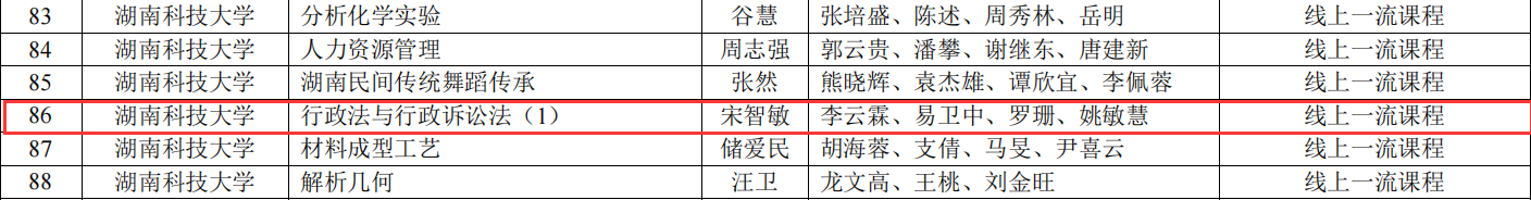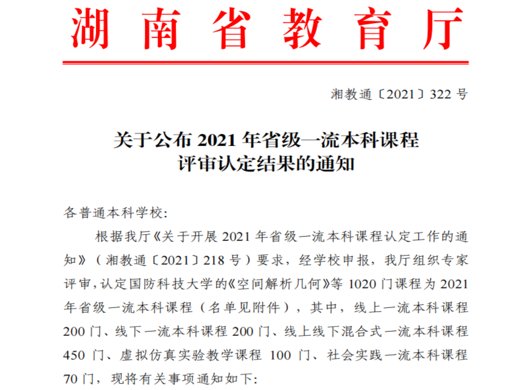 本次共认定 1020门课程为湖南省一流本科课程。其中,线上一流课程200门,虚拟仿真实验教学一流课程100门,线下一流课程 200 门,线上线下混合式一流课程450门,社会实践一流课程 70 门。太阳集团城网址83138共有44门课程入选“省级一流本科课程”。